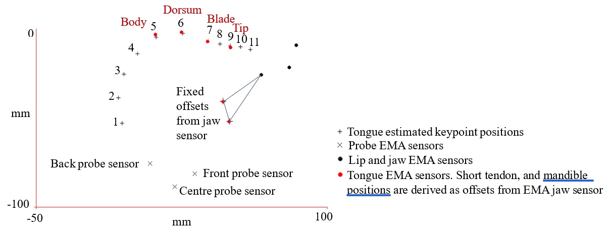 Figure 1: EMA sensor positions and keypoints (from SI hand labelled model) for a single frame after aligning Euclidean spaces using fiducial. Short tendon and mandible keypoints assigned as fixed offsets from the EMA jaw sensor.