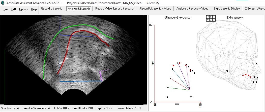The project can be loaded and analysed WITHOUT the requirement to pay for an AAA licence.  Download the latest version of AAA from the downloads menu on this website.  After installing AAA, go to the main menu option File | Open project to load the project. then select the Analyse ultrasonic tab at the top of the application. New data cannot be recorded or imported into these projects. They have been synchronised and tongue contours have been estimated using the EMA_MobileNetV2_100 model trained on EMA sensor positions from this speaker’s dataset.