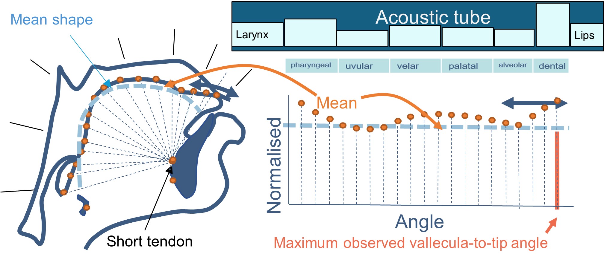The Glosstrum represents the acoustic tube, derived from normalised distances (actual distances / mean distances) from the tongue surface.