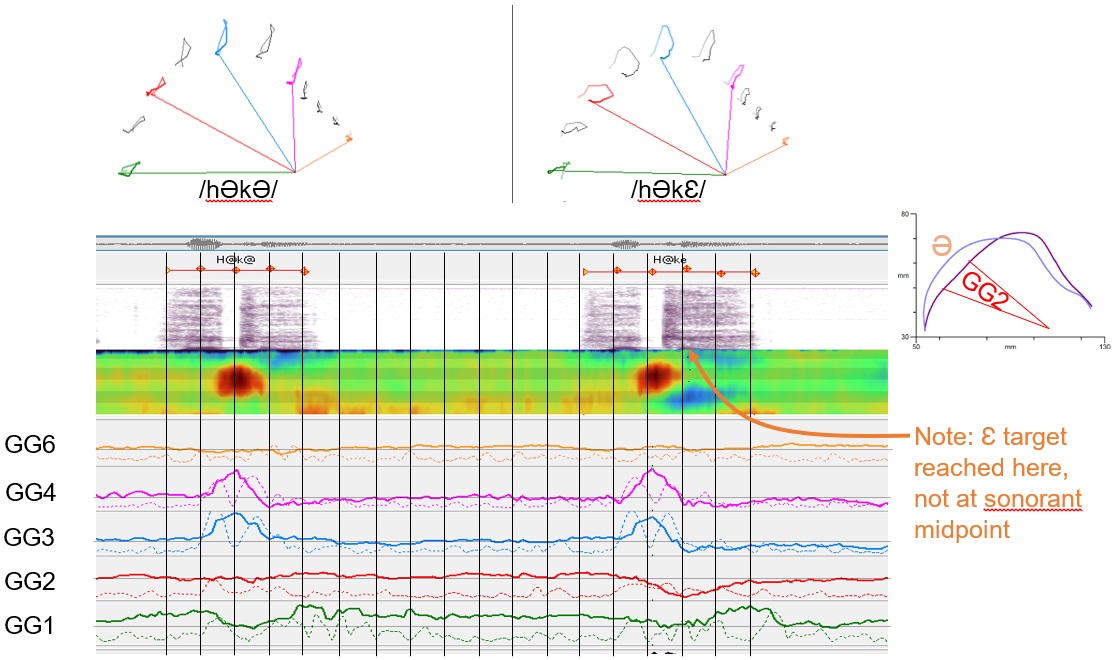 In the example below there is no contraction of GG2 when the final vowel is a schwa but when the final vowel is a front vowel, GG2 contracts creating a wider back cavity but also causing forward rostro-caudal rotation. The forward rotation of the tongue body results in a looping pattern of tongue surface keypoints as the articulation proceeds hƏkƐ and settles back to Ə.