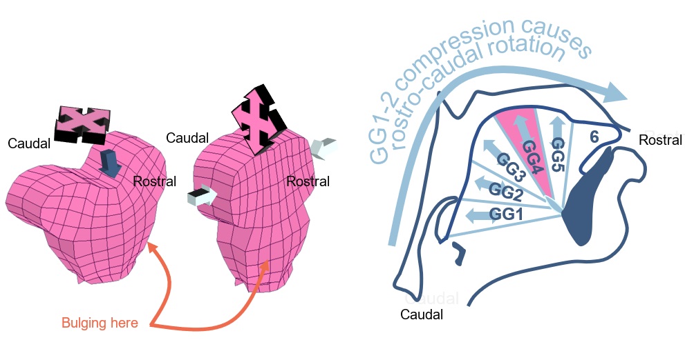 Biomechanical modelling shows contraction of genioglossus or transversus causes rostro-caudal expansion of a neuromuscular compartment which causes rotation about the short tendon attachment point.