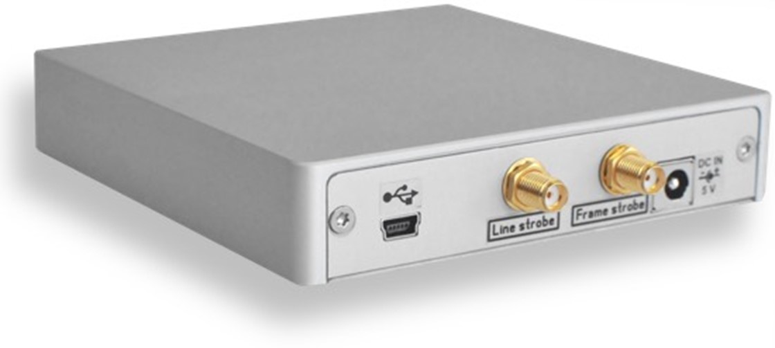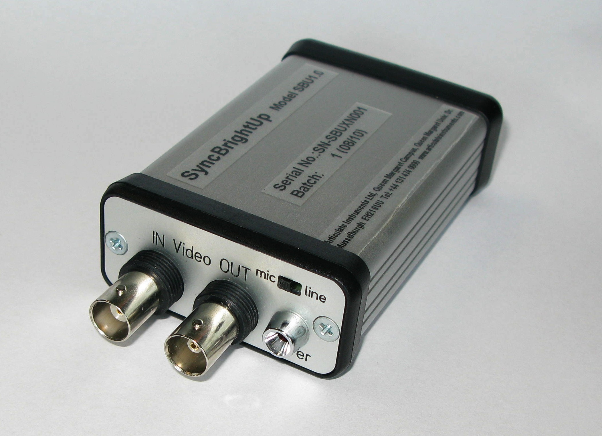The SyncBrightUp unit interrupts the camera signal and adds a white square to the top left of 4 de-interlaced image frames.